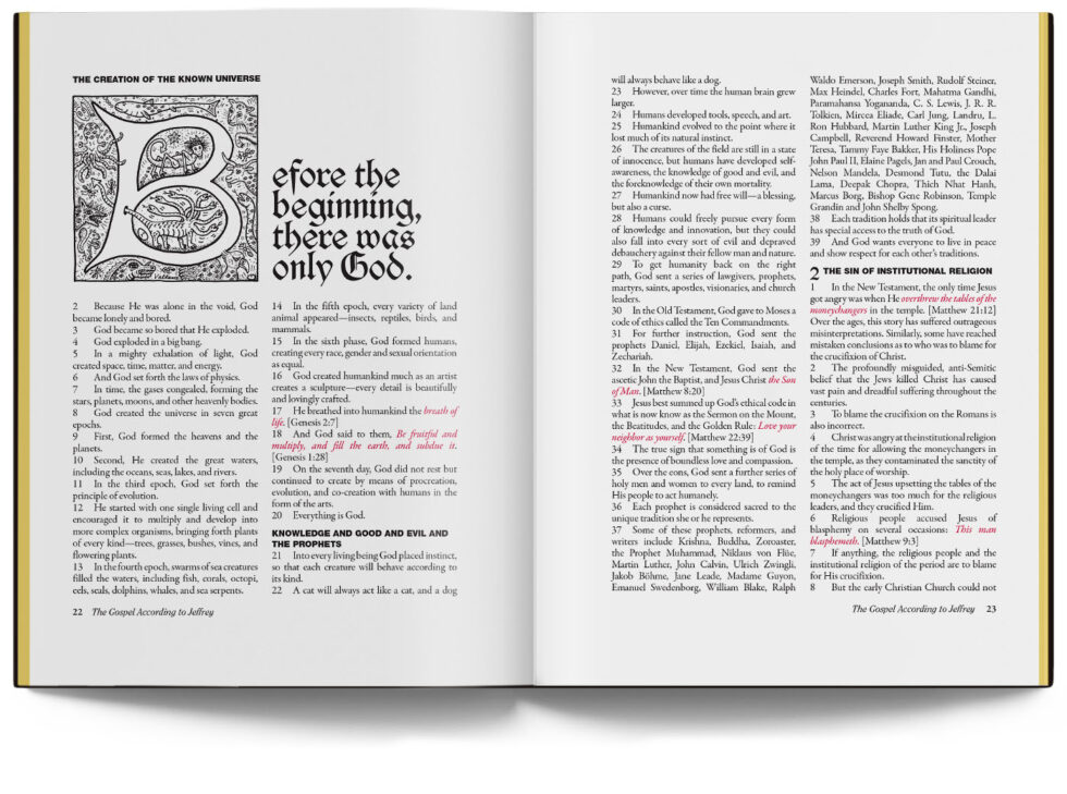 This was a fun solo project, based on popular 19th-century bible layouts. Casebound in leather (another edition in faux leather), with gilded edges and a bright red ribbon to hold your place, so you don’t get lost in the afterlife.